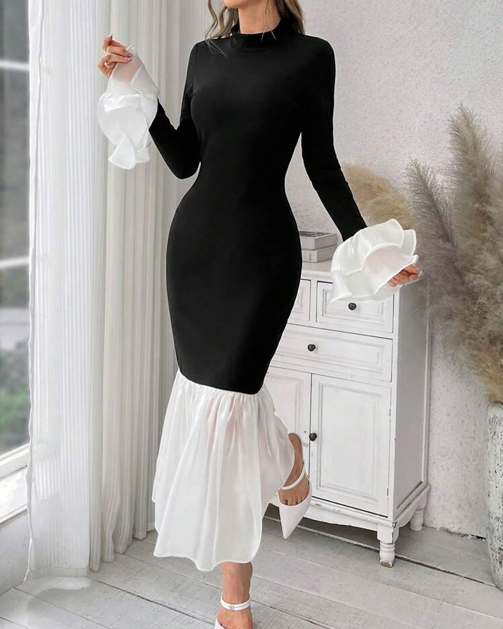 Women’s Elegant Semi-Sheer Long Bodycon Mermaid Hem Color-Block Off Shoulder Dre